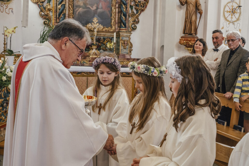 Ils affons dalla tiarza classa da Schluein e Sagogn ein envidai l’emprema ga alla meisa digl altar. La fiasta vegn embellida entras il cant dil chor.